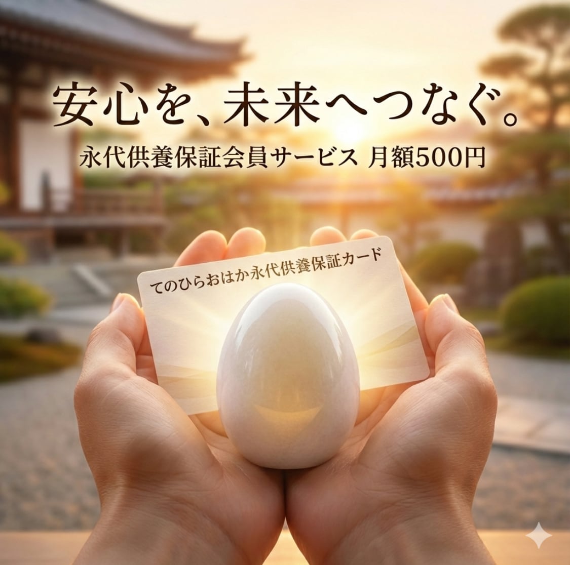 ⚠️ご注意ください⚠️ こちらは「永代供養保証サービス(月額制)」専用の案内ページです。 ※写真はイメージとなります。 ショップページの使用上、商品価格が表示されていますが、決済は行わず、ページ内下部の「永代供養保証サービス」のボタンよりお申し込みください。ご不明な点は、お気軽にお問い合わせください。 ご本人様にもしものことがあった場合も安心いただける、永代供養保証会員サービスのご案内です。 「私が旅立った後、この『てのひらおはか』はどうなってしまうんだろう?」 「誰にも迷惑をかけずに、きちんとした形で手放したい」 そんな切実な想いにお応えするための、安心サポート会員プランです。 本プランにご加入いただいている間、あなたに万が一のことがあった際、弊社が責任を持って「てのひらおはか」を、提携寺院にて永代供養(お焚き上げ・供養)させていただきます。 【本サービス内容】 ① 永代供養の確約(会員特典) 本サービスの会員様である限り、将来ご自身が亡くなられた後、弊社 へ「てのひらおはか」をご返送いただければ、追加費用なしで提携寺院にて丁重に永代供養いたします。 ② 「てのひらおはか永代供養保証カード」の発行 ご入会後、会員証として名刺サイズの「てのひらおはか永代供養保証カード」をご自宅へ郵送いたします。 ここには「この持ち主が旅立った際は、ここへ連絡してください」というメッセージと当店の連絡先が記載されています。お財布や『てのひらおはか』のそばに置いておくことで、発見者様(大家様、行政の方など)がスムーズに弊社へ連絡できるようになります。 【もしもの時の流れ】 1. 「てのひらおはか永代供養保証カード」を携行・保管 ご購入いただいたてのひらおはか本体のそばや、お財布の中にカードを入れておいてください。 2. 発見者様からのご連絡 万が一の際、ご親族や大家様、行政の方がカードを見て弊社へ連絡をいただきます。 3.ご供養 弊社より回収キット(着払い)を送付し、お品物を引き取ります。その後、責任を持って永代供養いたします。 【月額サービス費用】 月額:500円(税込) ※この費用は「積立金」ではなく、回収・供養をお約束するための「会員維持費(管理費)」および「カード発行・通信費」となります。 ※ご解約はいつでも可能です(解約された場合、永代供養の権利はなくなりますのでご注意ください)。 【ご注意事項】 ※必ずお読みください • 本サービスは、お客様の死後の「財産全ての処分」や「行政手続き」を代行するものではありません(いわゆる死後事務委任契約とは異なります)。あくまで『てのひらおはか』本体の回収と供養に限定したサービスです。 • ご遺体の引き取りや、お部屋の片付けなどは対応できません。 • お品物の回収には、発見者様(ご親族、大家様、福祉関係者様など)のご協力(ご連絡と発送)が必要となります。誰にも発見されず、ご連絡がない場合は対応できない場合がございますので、「てのひらおはか永代供養保証カード」を目立つ場所に保管してください。