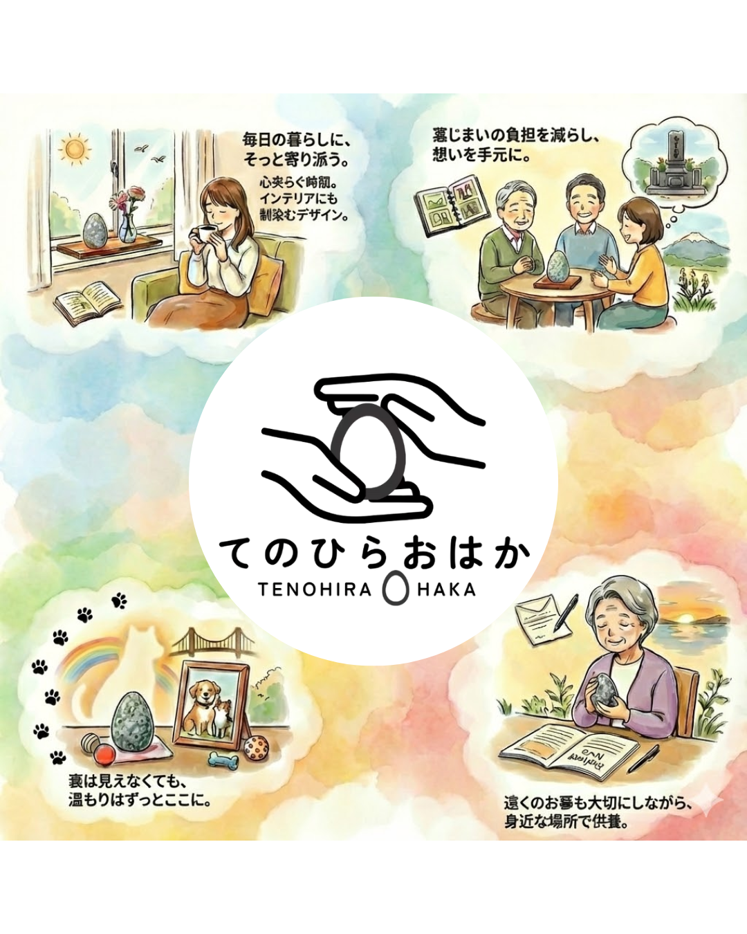 てのひらおはかは、従来のお墓とは異なり、ご自宅に置くことのできる小型サイズのお墓です。いつもそばに置いておけるお墓として、もっと身近に供養を行うことができます。「墓じまい」のタイミングでお手元に大切なお骨を。また元のお墓はそのままに「分骨」をして毎日お墓参りも。大切なご家族やペットのお墓としても、ご利用いただけます。